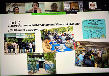 ထို့အပြင် “ရေရှည်တည်တံ့မှု နှင့် ငွေကြေးရံပုံငွေရရှိလည်ပါတ်နိုင်မှု” အကြောင်းအရာဖြင့် စာကြည့်တိုက်ဖိုရမ်ကိုလည်း အောင်မြင်စွာ ကျင်းပနိုင်ခဲ့ပြီး အတွေ့အကြုံကြွယ်ဝသော စာကြည့်တိုက်မှူး ၄ ဦးမှ လက်တွေ့ကျသော အမြင်များ၊